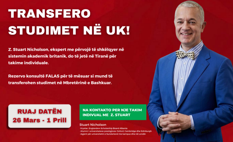 për të siguruar një takim individual drejtpërdrejt me z. Stuart Nicholson, konsulent me përvojë për studimet në Britani, me një karrierë të spikatur në Kolegjet Britanike si principal, dhe i diplomuar në University of Oxford dhe University of Edinburgh.