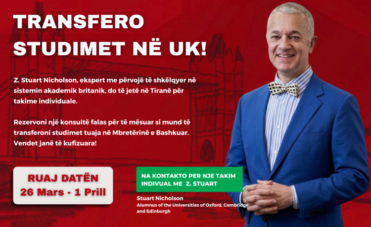 për të siguruar një takim individual drejtpërdrejt me z. Stuart Nicholson, konsulent me përvojë për studimet në Britani, me një karrierë të spikatur në Kolegjet Britanike si principal, dhe i diplomuar në University of Oxford dhe University of Edinburgh.